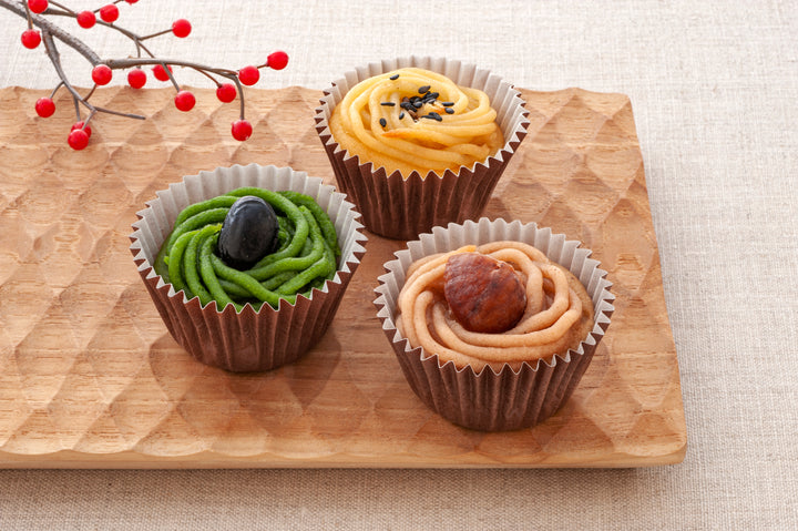肌寒い季節に旬を迎える素材、栗・さつまいも・黒豆抹茶の3種の焼きモンブラン。