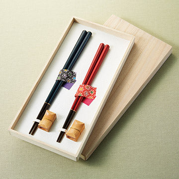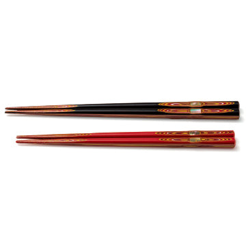 食卓をさりげなく彩る螺鈿細工を施した若狭塗の夫婦箸。螺鈿細工とは貝殻の内側、虹色光沢をもった真珠質の部分を薄く研磨したものを様ーな模様の形に切り、表面にはめ込み磨きだす装飾技法です。箸先には滑りにくい加工が施しており、現代の食生活に応じた使い勝手を重視して作られています。