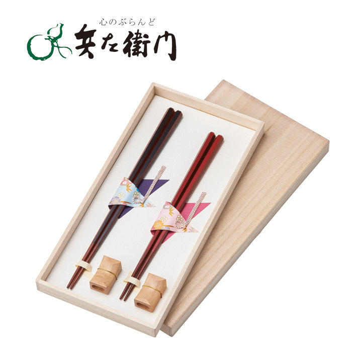 口に入れる箸先部分には一切合成化学塗料を使用しない漆を用いたお箸です。【商品】黒(全長約23.5cm)・朱(全長約21.5cm)各1・箸置(約3.2×1.8×高さ1.3cm)×2、木箱入