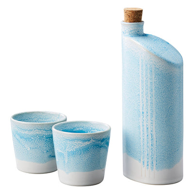 信楽焼は、日本六古窯のひとつに数えられており、滋賀県甲賀市信楽を中心に生産されています。信楽焼の魅力は、なんといっても素朴なまでの土の風合い。自然の豊かさをそのまま活かした力強さです。その素朴な味わいとぬくもりは、長い歳月を超えて人々に愛されてきました。現在でもその伝統を受け継ぎながら、自然そのものの生命感と土との相性、そして現代に求められる「遊び」と「癒やし」を吹き込み、独自の器観をひとつひとつ表現したアイテムが生産されています。丹精込めた陶工たちの手仕事が作り出す妙味は、信楽焼独特の趣です。「イオンボトル 綾」は、信楽焼の趣を持ちながら、機能性も併せ持ったアイテムです。信楽の粘土より採取されたラジウム鉱石を使用した釉薬が、ボトル内にイオンを発生させることで、一昼夜程で入れた飲み物を美味しくまろやかにしてくれます。水はもちろん、焼酎などのお酒を入れるのもおすすめです。ボトルのフォルムは、女性でも持ちやすく、冷蔵庫のポケットにも入り、上から見ると雫の形となるデザイン。商品の彩りが釉薬の流れる色のバランスによって決まる為、ひとつひとつが異なる風合いを持つ一品です。直線と曲線のモダンなシルエットが美しく、雅な色合いと質感がテーブルを華やかに演出してくれます。【商品】ボトル(約10×7×高さ26cm・900ml)×1・カップ(約口径9×高さ8.5cm・300ml)×2