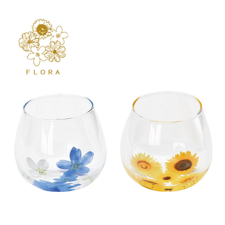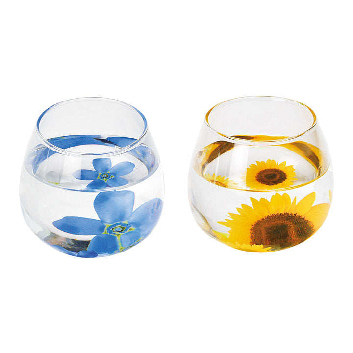 色鮮やかな花を浮かべた花手水をモチーフにした「ゆらりグラス」。見る角度によってその表情が変わります。【商品】グラス(約口径6.5×高さ8cm・320ml)×2