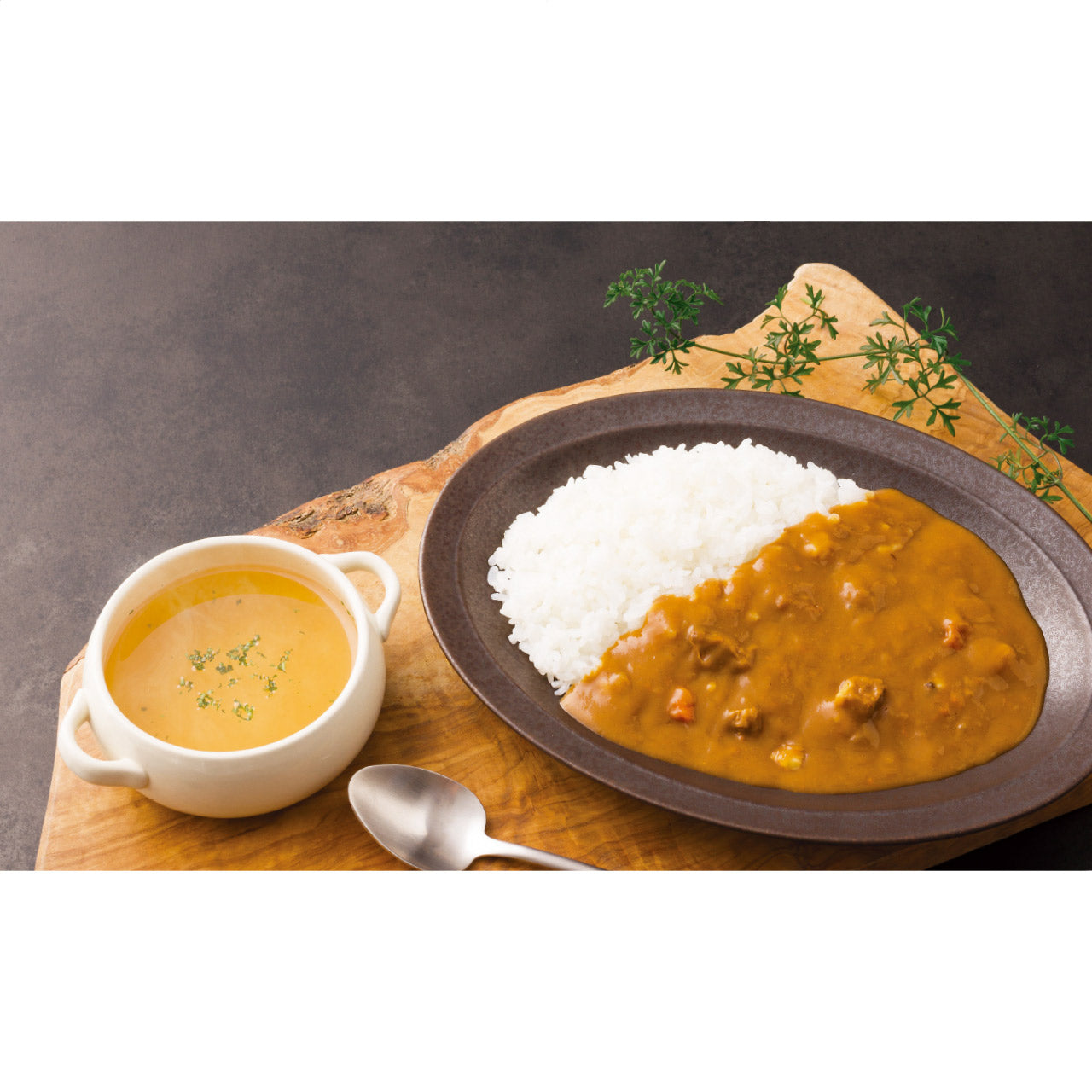 素材から出る甘みと香辛料が程よくマッチしたまろやかでコクのあるビーフカレーです。玉ねぎの名産地、淡路島で採れた糖度の高い「フルーツ玉ねぎ」を使用して作った玉ねぎスープです。まろやかでコクのある味わいでカレーとの相性も抜群です。