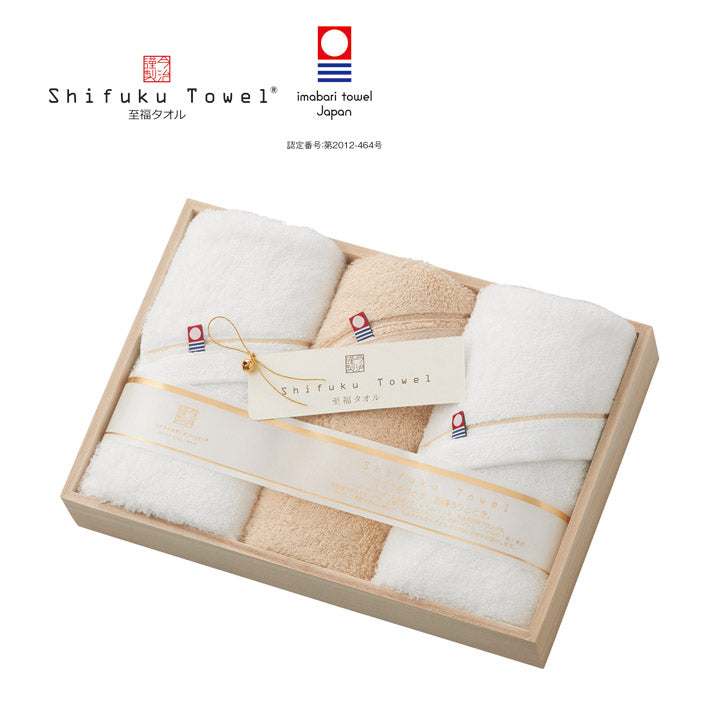 「至福タオル」愛媛県の「今治」の町の名前は高品質タオルの代名詞として、今や日本のみならず海外にまで知られるほどになっています。古来から続く綿織物の町・今治は、受け継がれてきた伝統と匠たちの技術を今日まで進化させてきました。【商品】フェイスタオル(約33×75cm)×2・ウォッシュタオル(約33×31cm)×1、木箱入