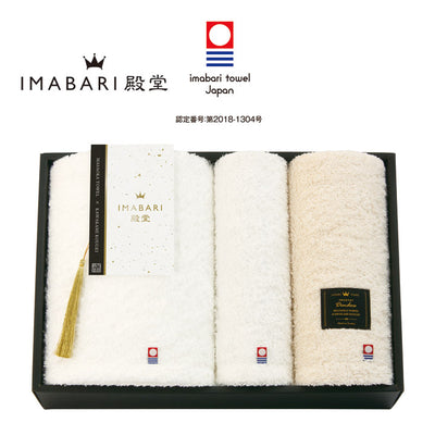 「IMABARI殿堂」は、職人のこだわりが詰まった今治タオルです。こだわりの一つは「糸」です。一般の糸より太く光沢感のあるサンホーキン綿の中空糸を使用しています。糸内部の空洞に空気を含むため吸水性が良く軽やかです。この糸をロングパイルに織ることで、ボリューム感があり肌触りの良いタオルに仕上げました。また、タオルを織ったあとの洗い工程では、「水」と「洗い方」にこだわっています。飲料水としても使用できる愛媛県西条市のうちぬきの水(石鎚山系の天然地下水)で洗うことで、綿本来の柔らかさを十分に引き出しています。さらに、糸自体に負担をかけず揺らすように時間をかけて洗うため、洗濯を重ねても柔らかさと吸水性が長持ちします。やさしい色合いでシンプルなデザインのため男女問わず贈りやすいギフトです。素材と製法にこだわった「IMABARI殿堂」のタオルは、大切な方への贈り物におすすめです。【商品】バスタオル(約50×110cm)・フェイスタオル(約34×80cm)・ハンドタオル(約34×34cm)各1