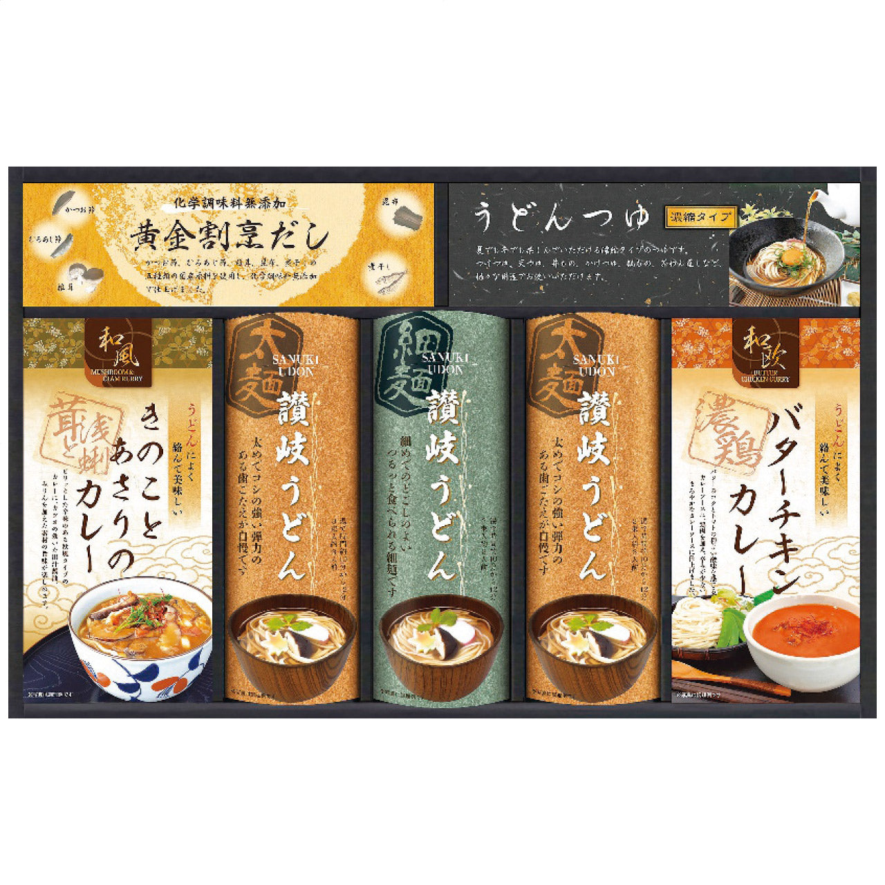 讃岐うどん300g(太麺2袋・細麺1袋)・うどん用きのことあさりのカレー200g・うどん用バターチキンカレー200g各1袋・麺つゆ(濃縮タイプ)20ml×4袋・黄金割烹だしパック8g×4袋