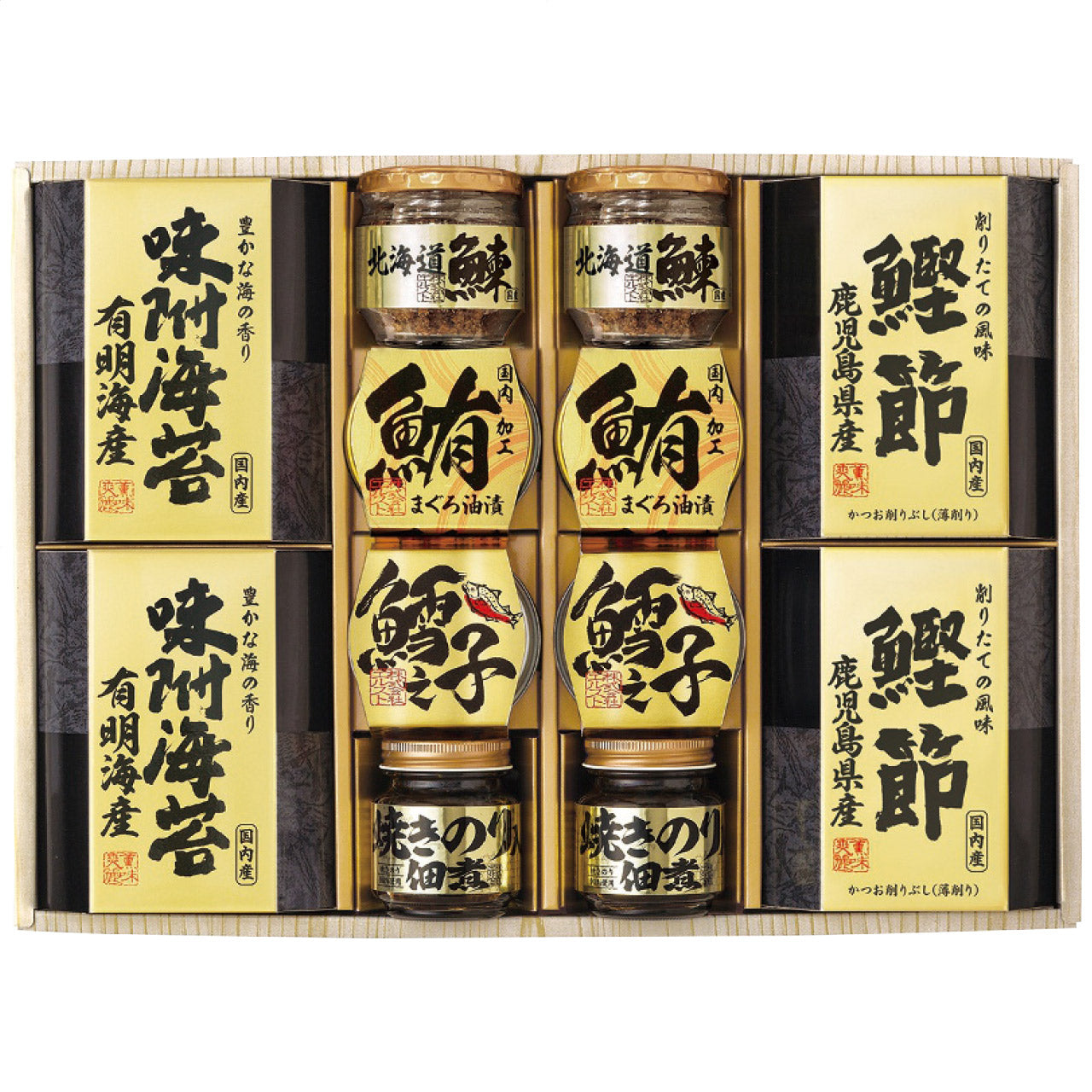 北海道産鰊フレーク50g・焼きのり佃煮85g各2瓶・鰹削り節(2g×3袋)・有明海産味付け海苔(8切10枚)各2箱・まぐろ油漬け70g・鱈之子味付け70g各2缶