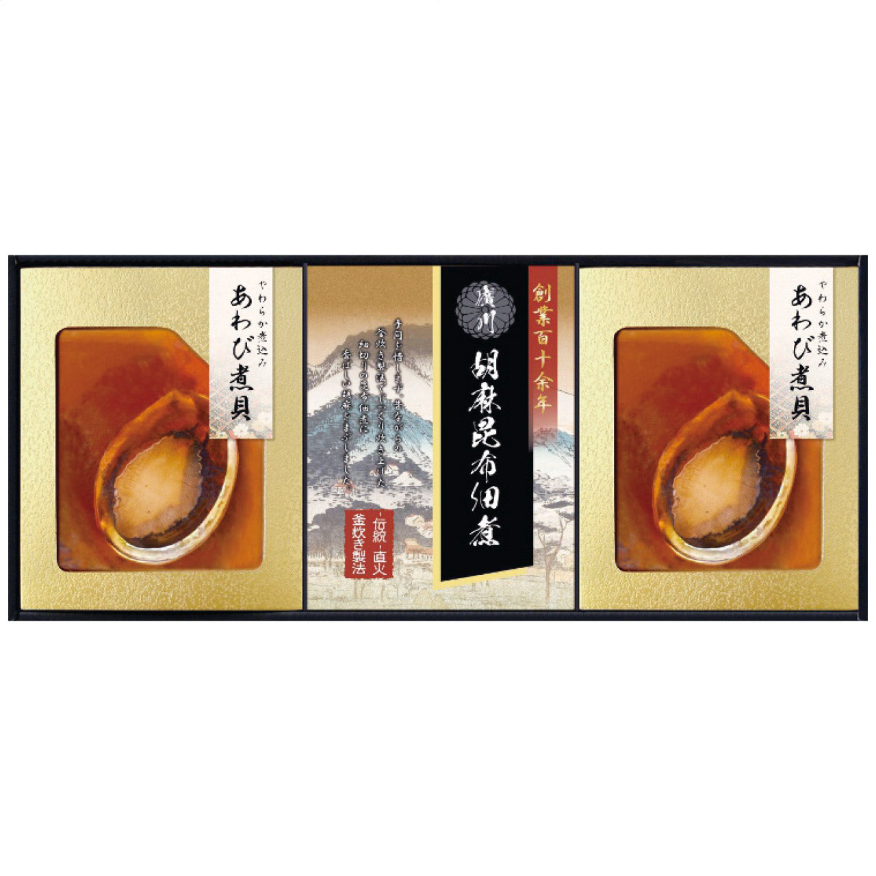 あわびをじっくりと煮上げた「あわびの煮貝」は、ふっくらやわらかく仕上げ、あわびの豊潤な香りをお楽しみいただけます。創業百十余年の廣川昆布の佃煮とセットになった高級贈答品となっています。