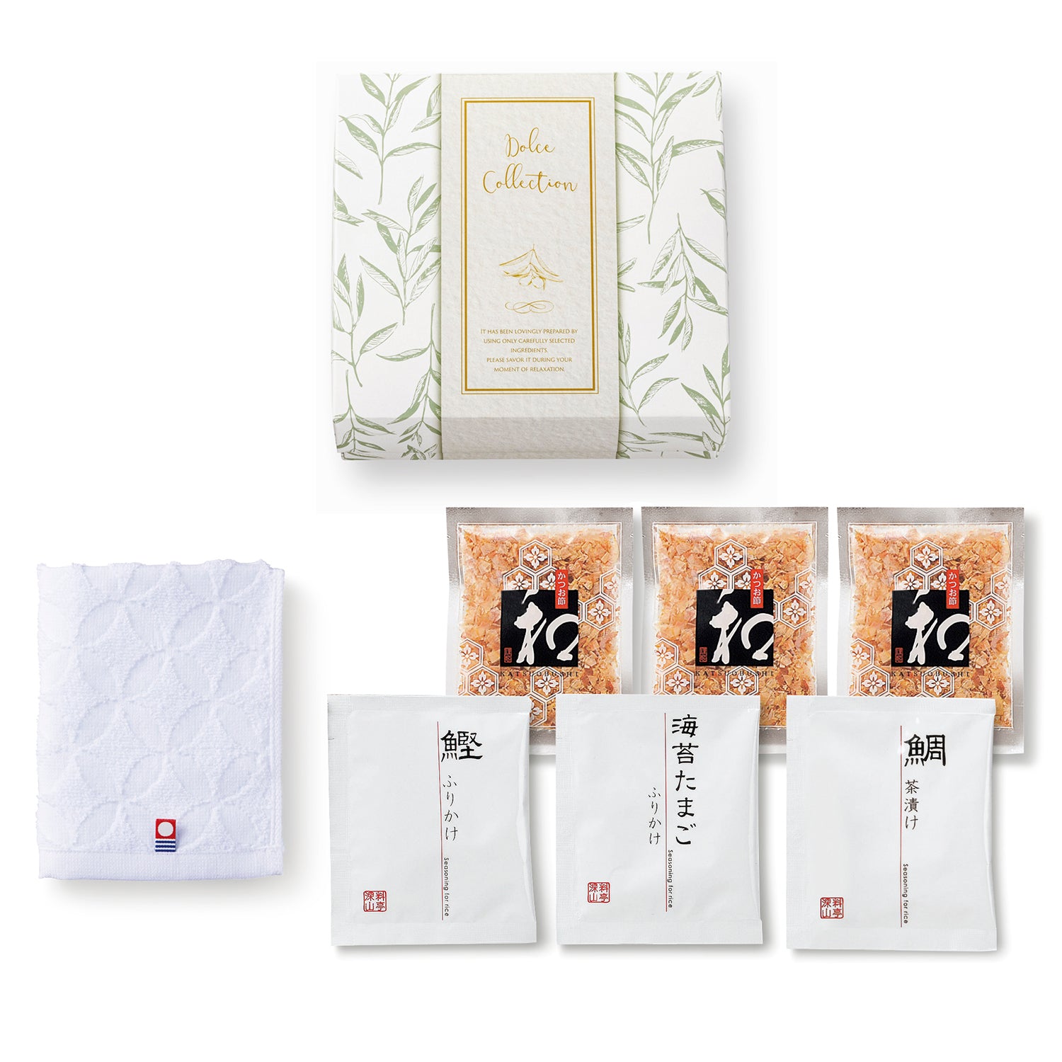 夫婦円満の意味を持つかつお節と、糸と糸がつながり作られることから「人と人との縁=運命の糸」を意味する今治タオルをセットにしました。使いやすいサイズのウォッシュタオルは縁起のよい七宝柄です。