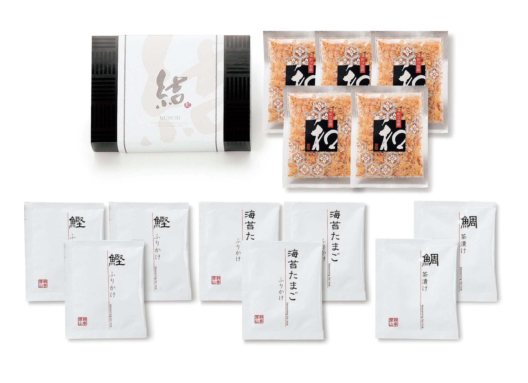 かつおの旨みを凝縮した鰹節やおめでたい鯛の身が入った鯛茶漬けなど、ご飯の美味しさを引き立てるたくさんの縁起物をバランスよく揃えた定番ギフトです。