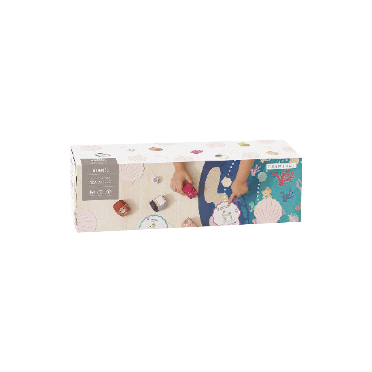 4.5×4.5×5.5cmおてだま6個・綿、ポリエステル、ナイロン、ポリエチレン・2×2×2cmサイコロ1個・ABS樹脂、紙、ポリプロピレン・10.5×10.5cmおてだまカード50枚・紙・70×70cmおてだまシート1枚・紙、ポリプロピレン38.5×11.5×11.5cm