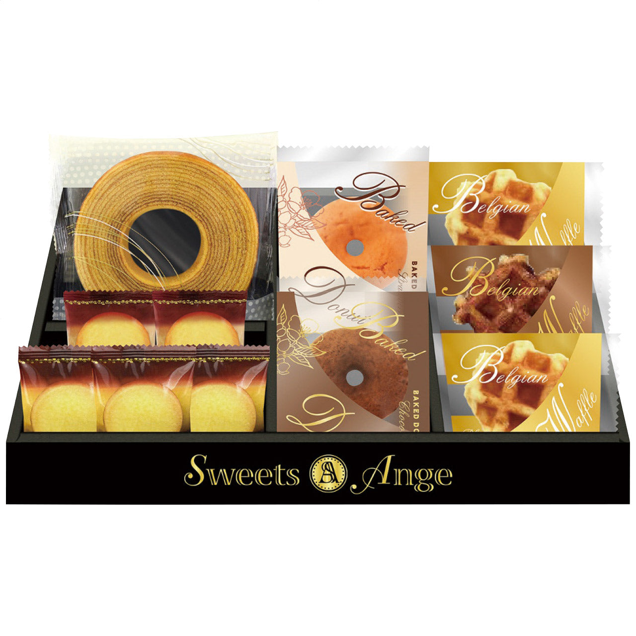 ベルギーワッフル(プレーン2個・ショコラ1個)・ミルクバウムクーヘン1個・ベイクドドーナツ(ストロベリー・ショコラ各1個)・プレーンクッキー5個