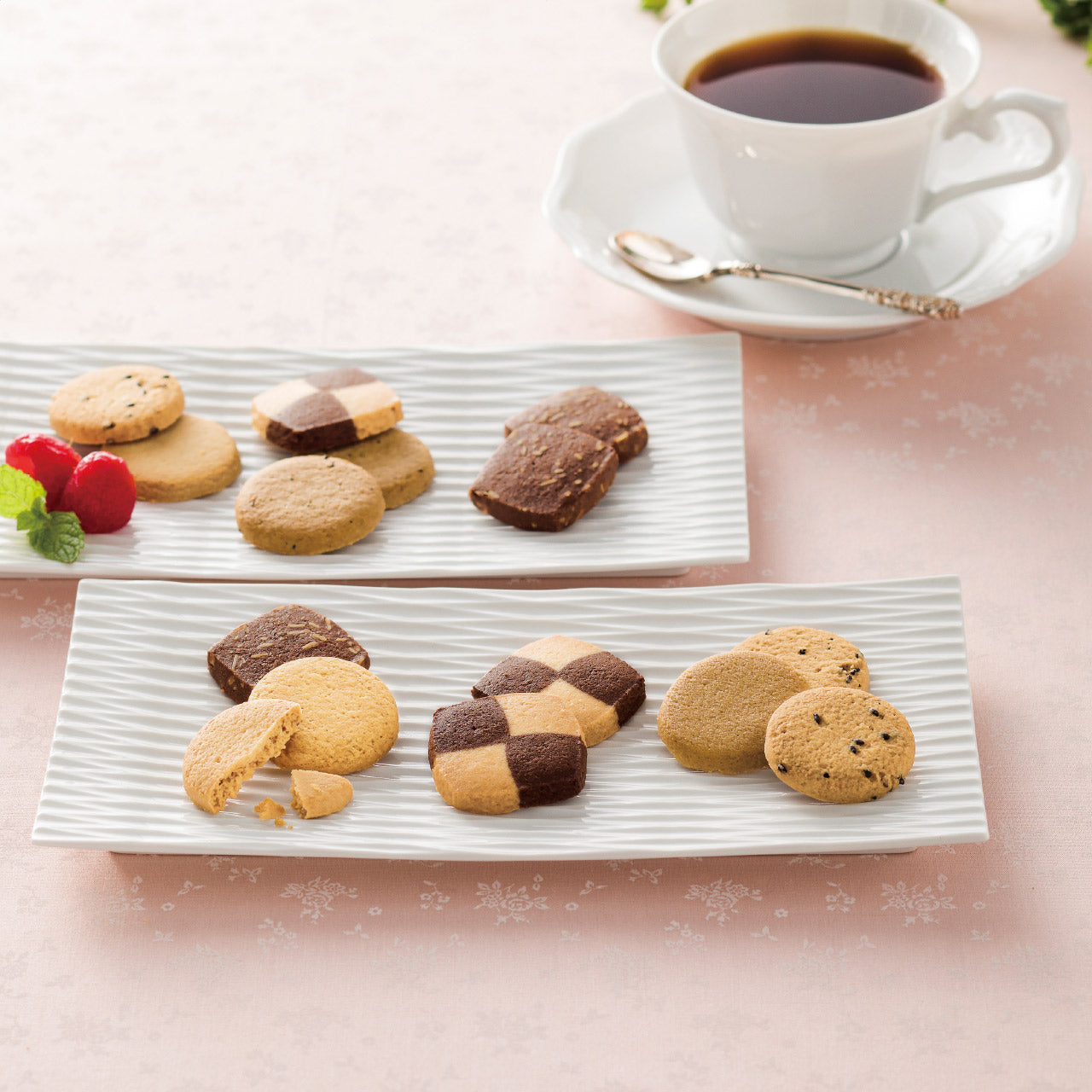 スペシャルブレンドコーヒー(7g×2袋)・キリマンジャロブレンドコーヒー(7g×1袋)・クッキー(紅茶・カフェキャラメル・プレーン・セサミ各3枚・モザイク・チョコアーモンド各2枚)