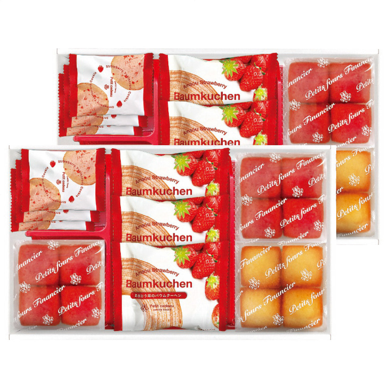 国内製造小麦粉とあまおう苺濃縮果汁を使用し、苺の風味と味わいを生かして一層一層丁寧に焼き上げたバウムクーヘンと、ひとくちサイズのしっとりとした食感で仕上げ、トンネルオーブンを使用することによりふんわりと焼き上げたフィナンシェ、ほろろとした食感とフリーズドライのいちごを使用したざくっとした食感のアイスボックスクッキーの詰め合わせですあまおう苺バウムクーヘン6個・プチフィナンシェ4個入(あまおう苺4個・プレーン2個)・焼きほろろクッキー(イチゴ)6個31.3×19.5×12cm