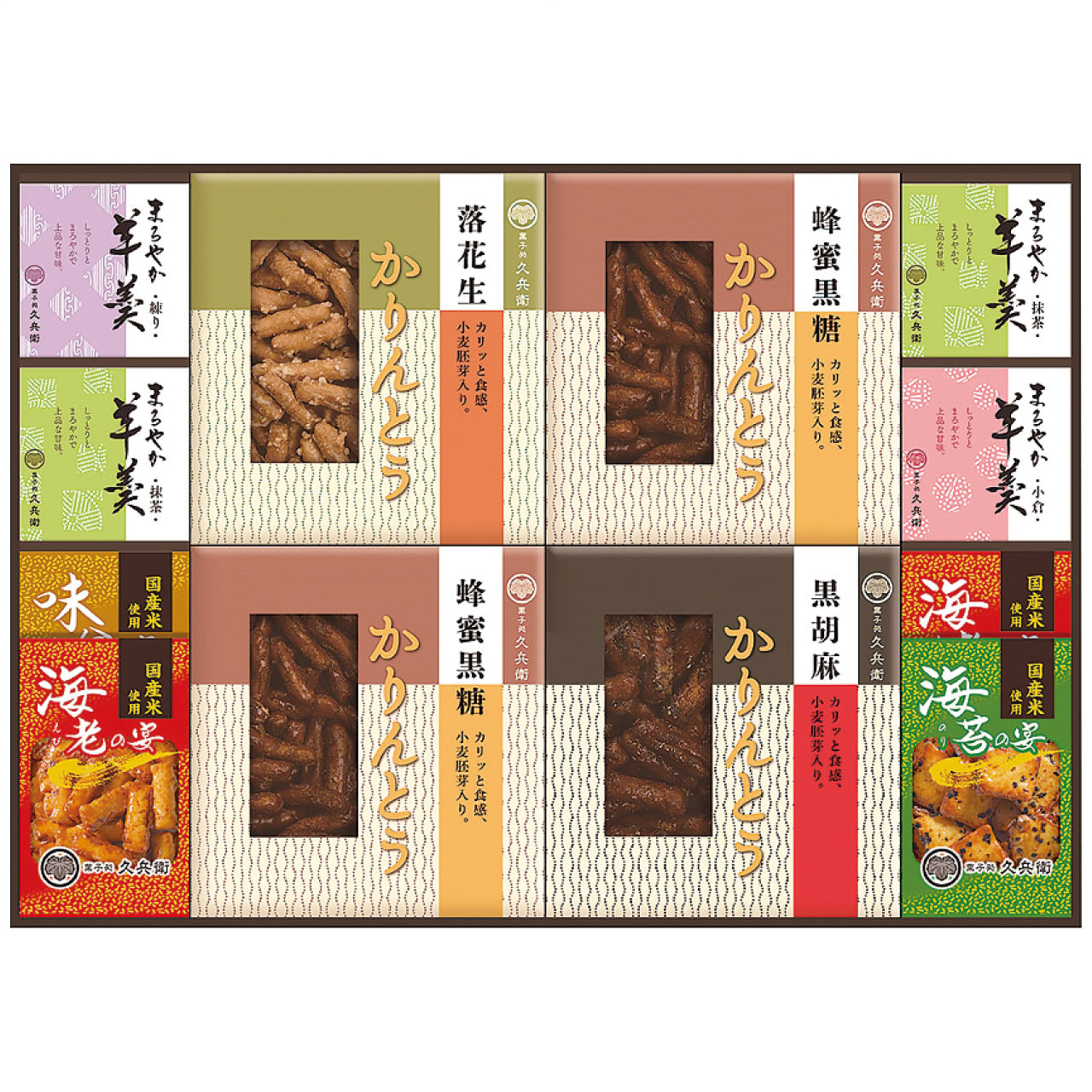 昔ながらの素朴な味のかりんとう、夏でも冬でも楽しめるまろやか羊かんと国産米だけで作った3種類のあられを詰め合わせました。
