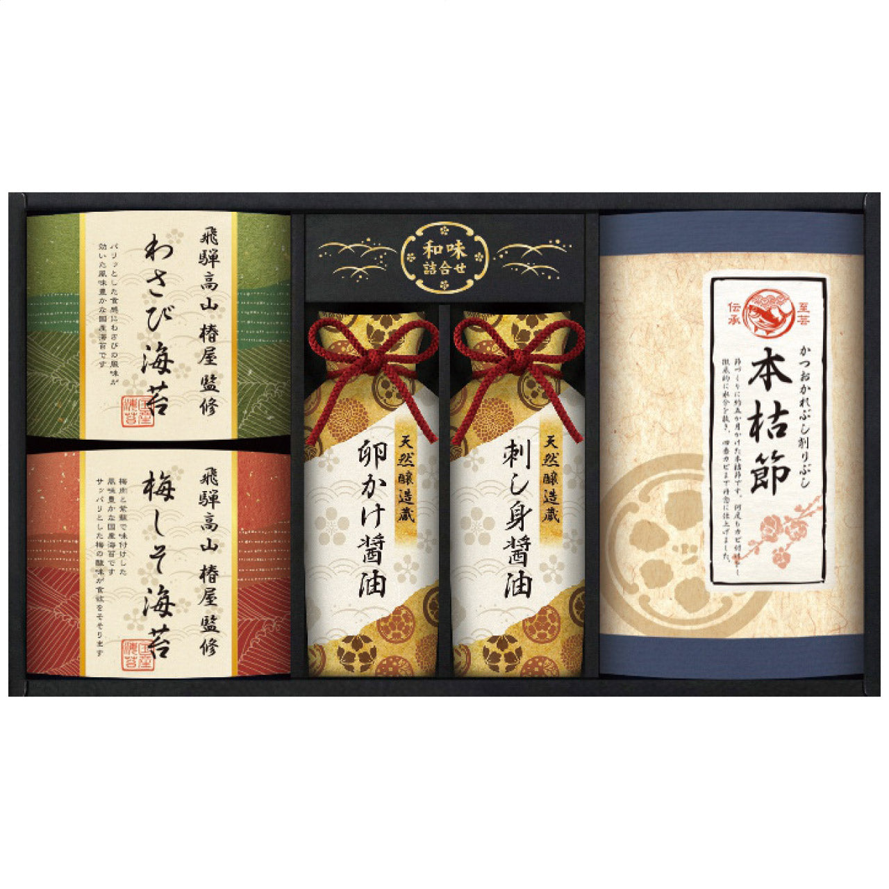 飛騨高山椿屋監修わさび海苔(8切6枚)・飛騨高山椿屋監修梅しそ海苔(8切6枚)各1袋・本枯れ鰹節2g×3袋・天然醸造蔵醤油200ml(卵かけ・刺し身)各1本