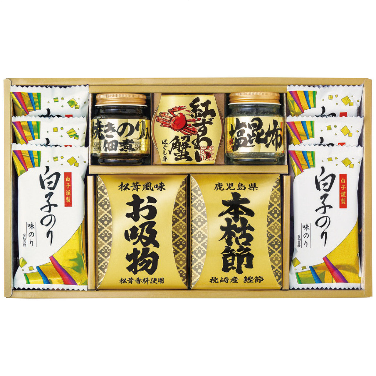 鰹本枯れ節(2.5g×2袋)・松茸風味お吸い物(2.3g×3袋)各1箱・焼きのり佃煮85g・塩昆布18g各1瓶・白子のり味のり(8切5枚)6袋・紅ずわいがにほぐし身55g×1缶