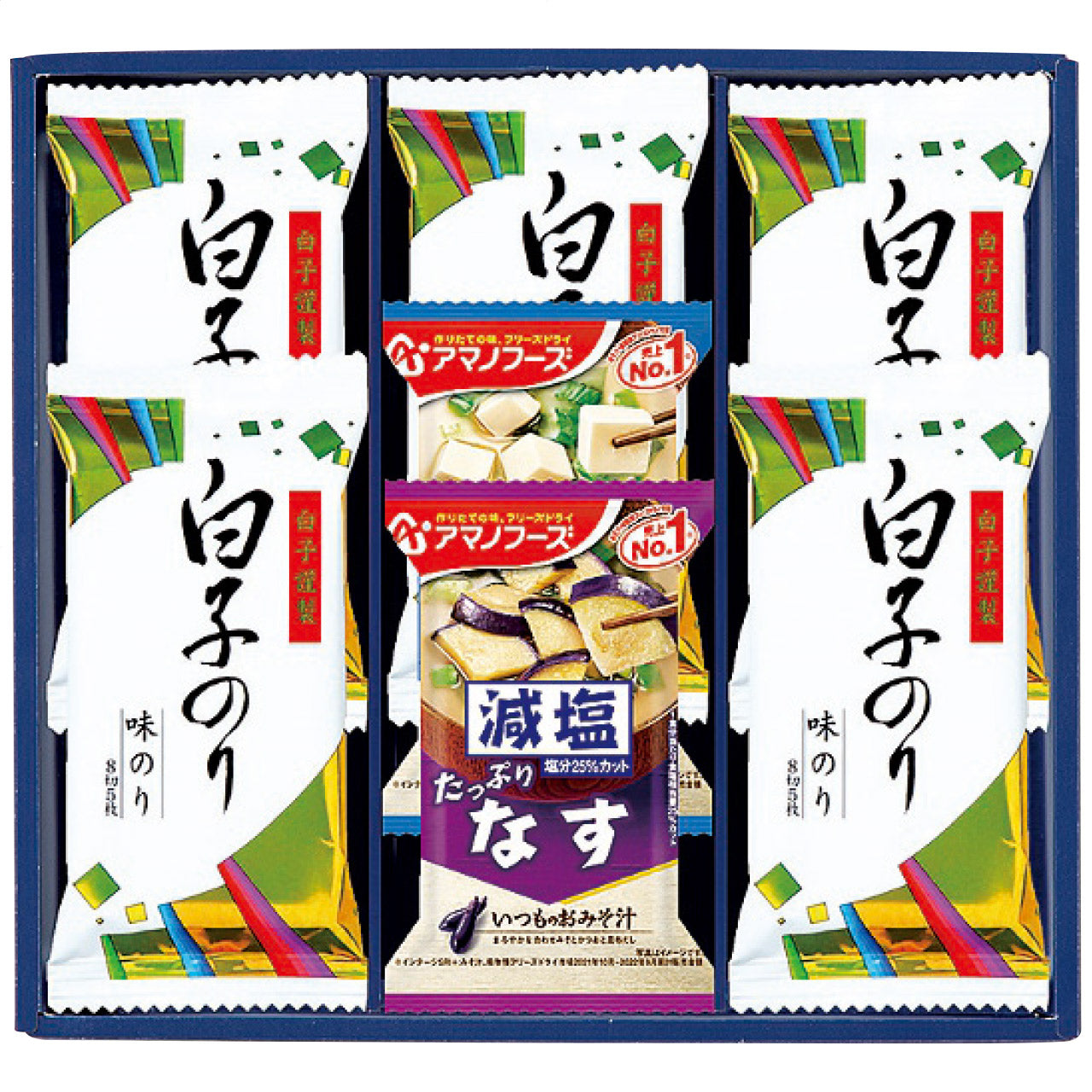 アマノフーズの減塩タイプみそ汁と白子のり味のりを詰合せました。