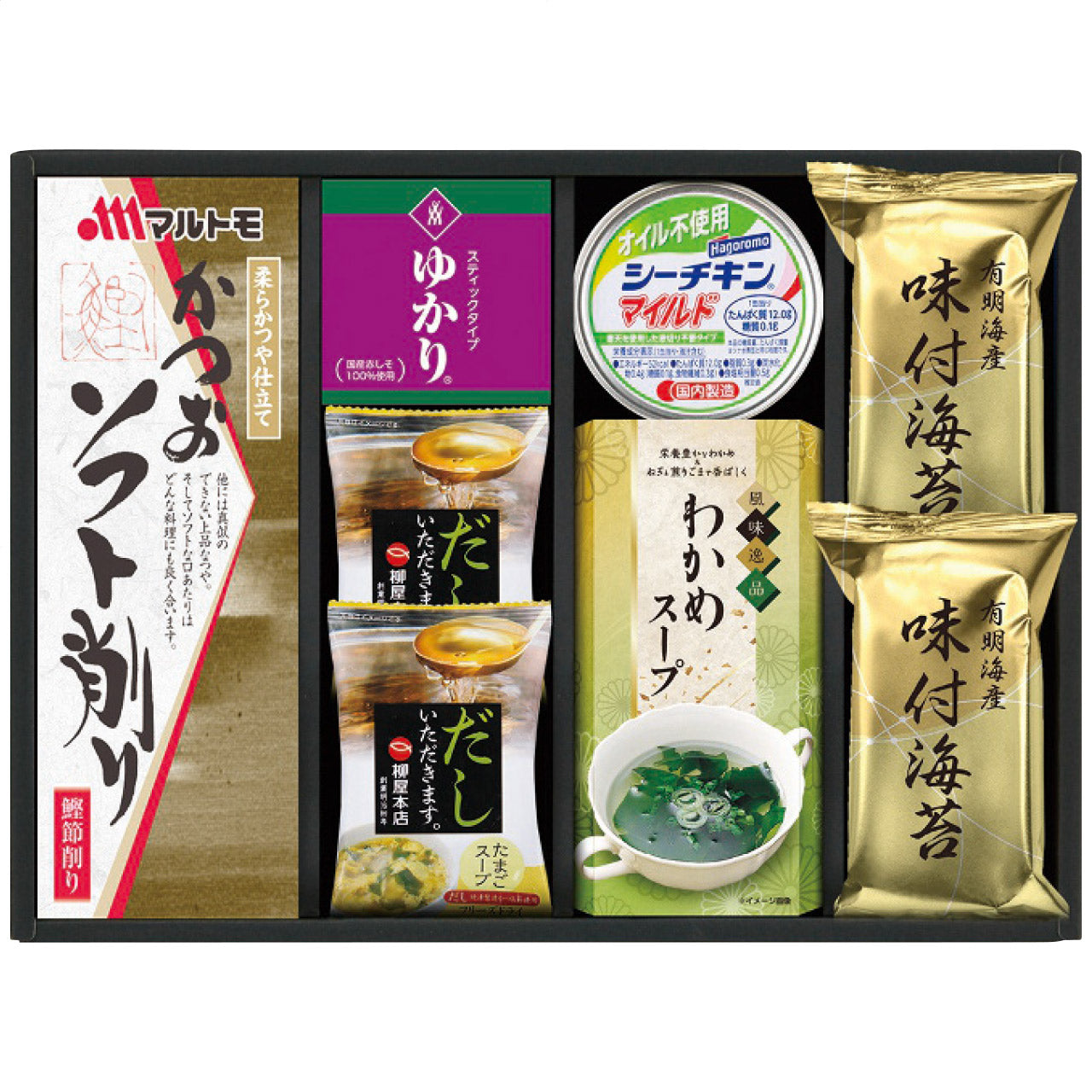 マルトモかつおソフト削り(2g×4袋)・三島食品ゆかりスティックタイプ(1.7g×4袋)・わかめスープ(5.3g×2袋)各1個・たまごスープ5.4g・有明海産味付海苔(8切4枚)各2袋・はごろもフーズオイル不使用シーチキンマイルド70g×1缶