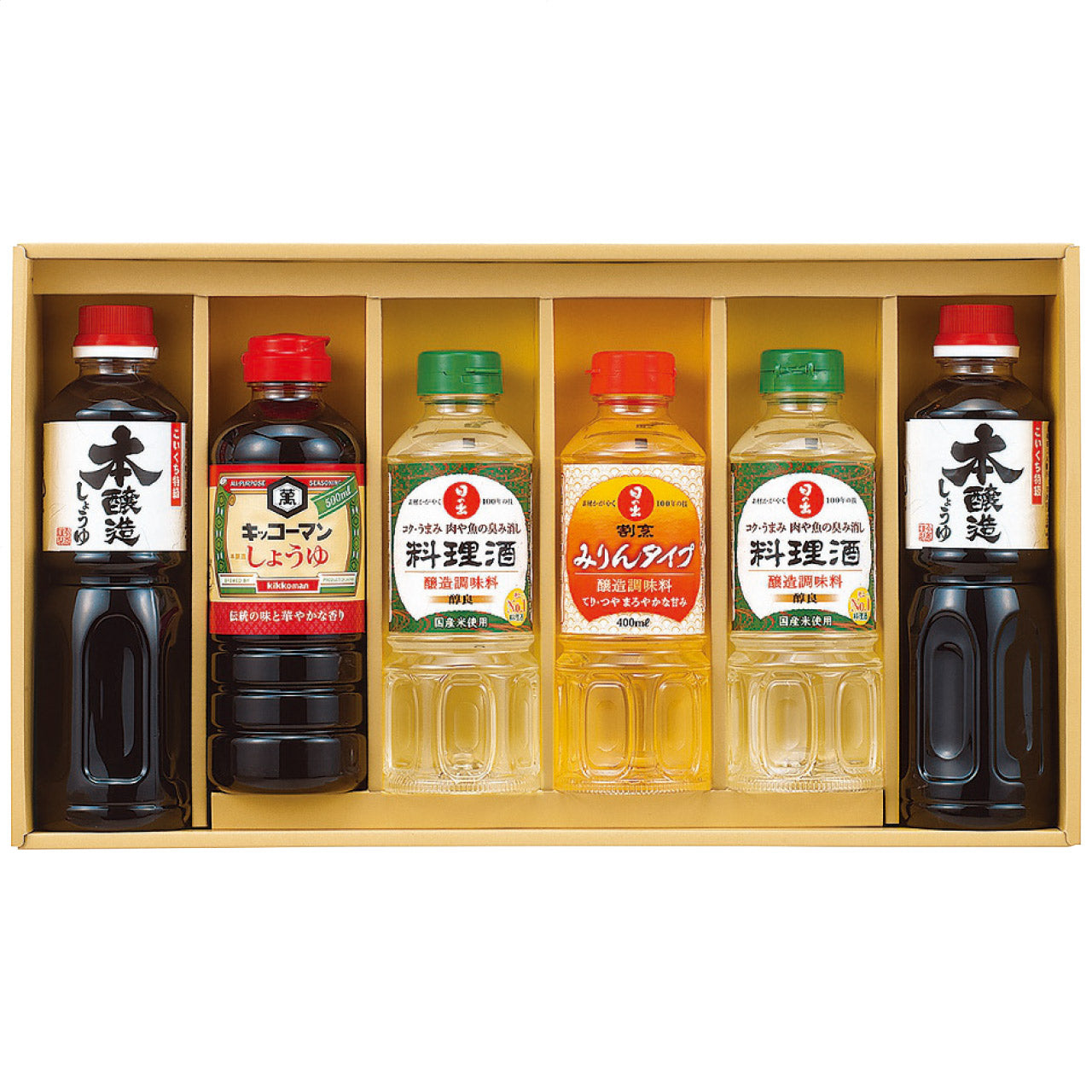 キッコーマンこいくちしょうゆ1本・サンビシ本醸造しょうゆ2本・各500ml・日の出料理酒2本・日の出割烹みりんタイプ1本・各400ml