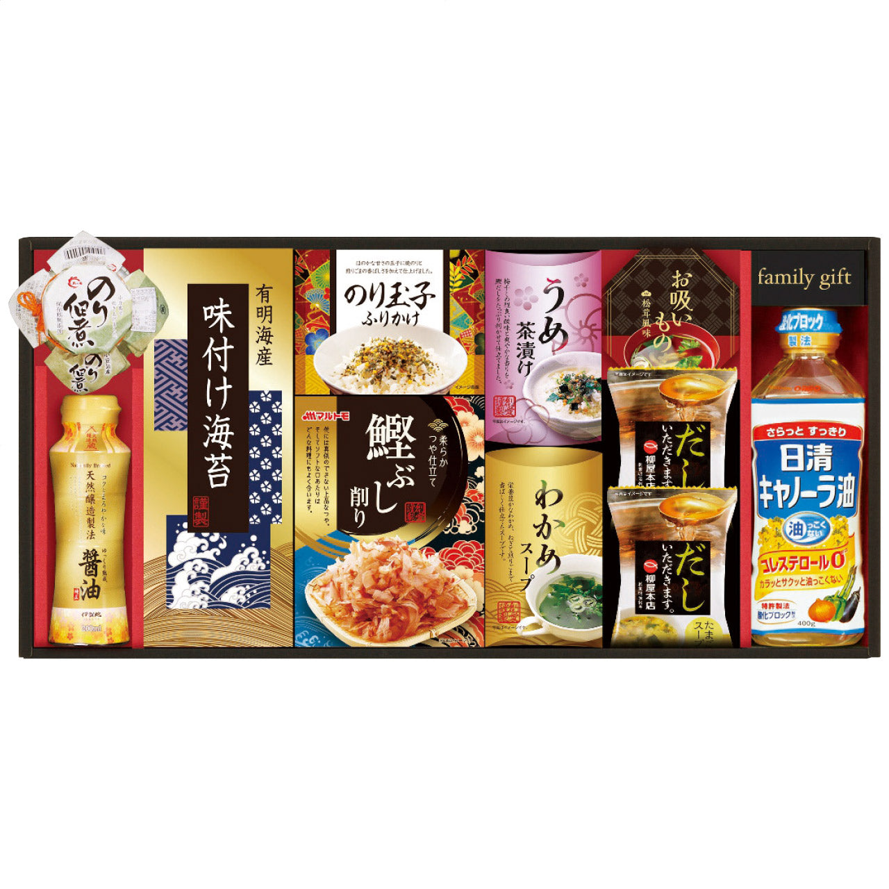 有明海産味付け海苔(3切4枚)・のり玉子ふりかけ(4.5g×2袋)・鰹節削り(2g×4袋)・うめ茶漬け(4.3g×2袋)・わかめスープ(5.3g×2袋)・永谷園お吸いもの松茸風味(2.3g×2袋)各1個・たまごスープ5.4g×2袋・島の香のり佃煮80g×1瓶・伊賀越天然醸造醤油200ml・日清キャノーラ油400g各1本