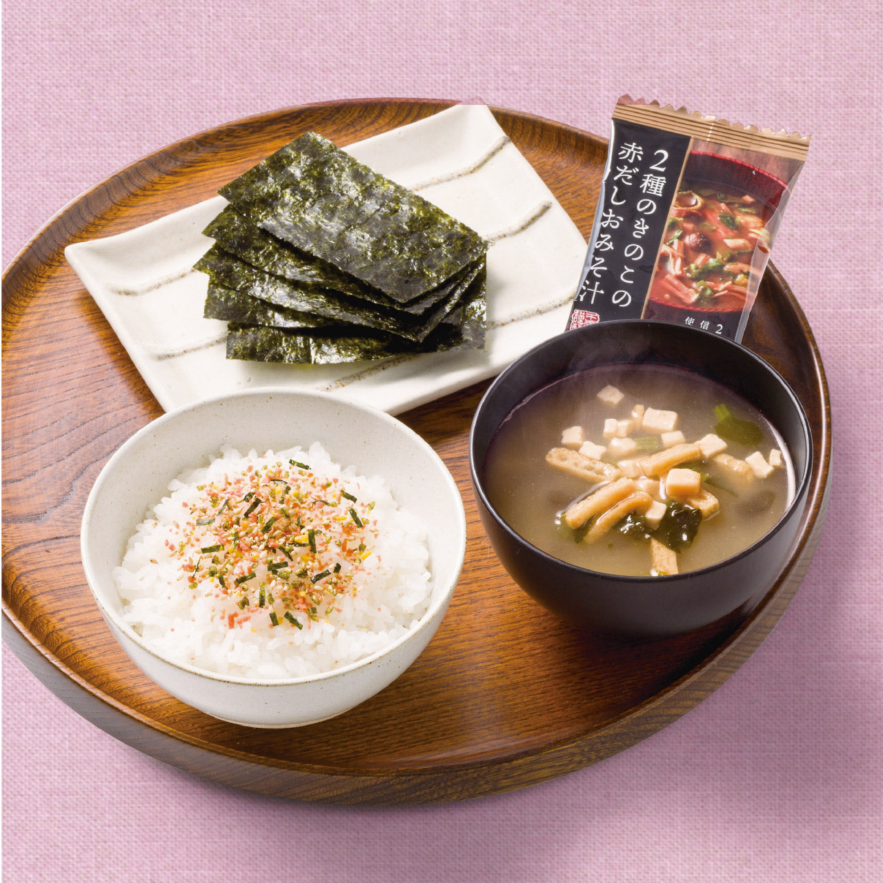 ヤマサ鮮度しょうゆ200ml×1本・豆腐と油揚げのおみそ汁9.2g・2種のきのこの赤だしおみそ汁7.1g・あおさとわかめのおみそ汁6g・オクラ入ねばねば野菜スープ5.8g各1袋・丸美屋たまごふりかけ(2.5g×3袋)・丸美屋さけふりかけ(2.5g×3袋)各1箱