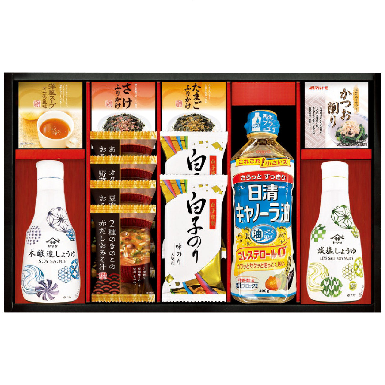 ヤマサ鮮度しょうゆ200ml・ヤマサ鮮度減塩しょうゆ200ml・日清キャノーラ油400g各1本・豆腐と油揚げのおみそ汁9.2g・2種のきのこの赤だしおみそ汁7.1g・あおさとわかめのおみそ汁6g・オクラ入ねばねば野菜スープ5.8g各1袋・丸美屋たまごふりかけ(2.5g×3袋)・丸美屋さけふりかけ(2.5g×3袋)・丸美屋洋風スープオニオン風味(2.5g×3袋)・マルトモかつお削り(0.7g×3袋)各1箱・白子のり味のり(8切5枚)2袋