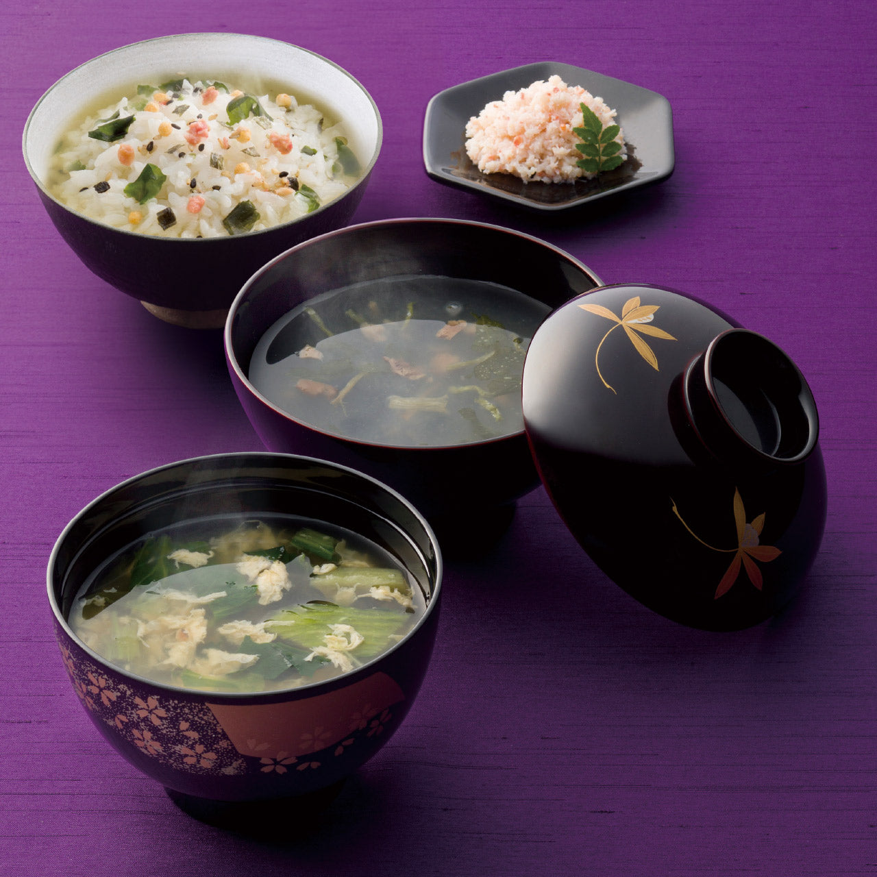 あわび・松茸の贅沢な食材を使用したフリーズドライと松茸風味のお吸い物、紅ずわいがにや海老みそ汁を詰め合わせました。