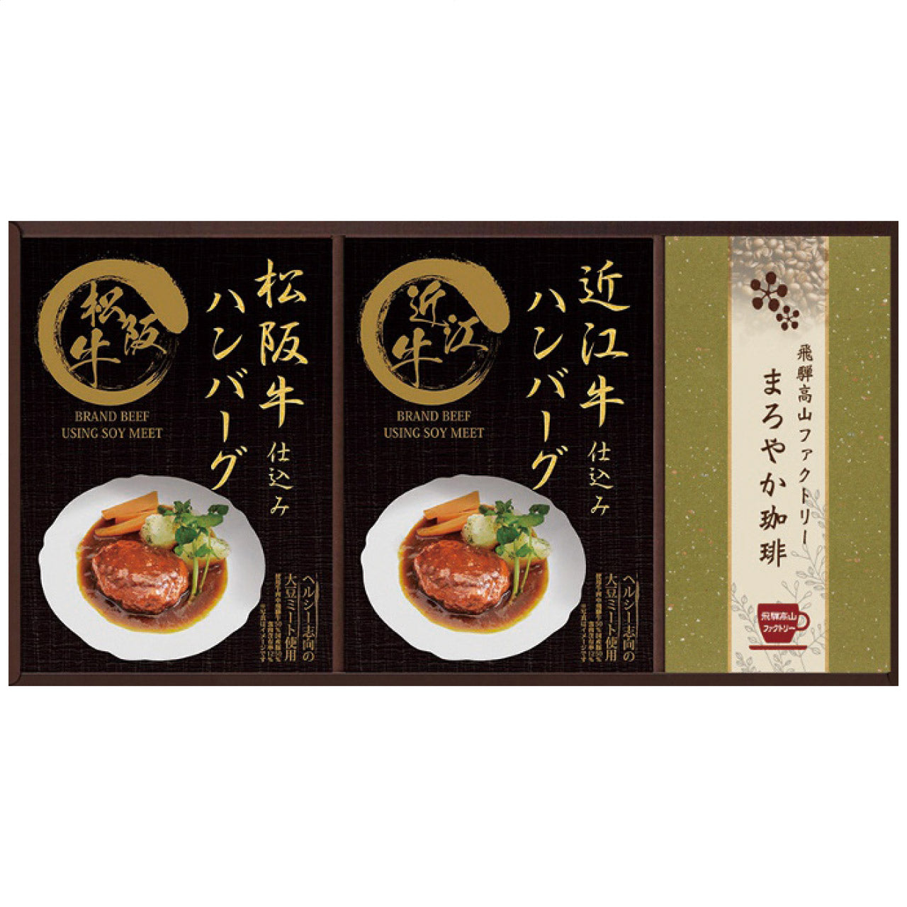 松阪牛仕込みハンバーグ(大豆ミート入)130g(固形量80g)・近江牛仕込みハンバーグ(大豆ミート入)130g(固形量80g)各1袋・飛騨高山ファクトリードリップコーヒー(まろやか)3袋