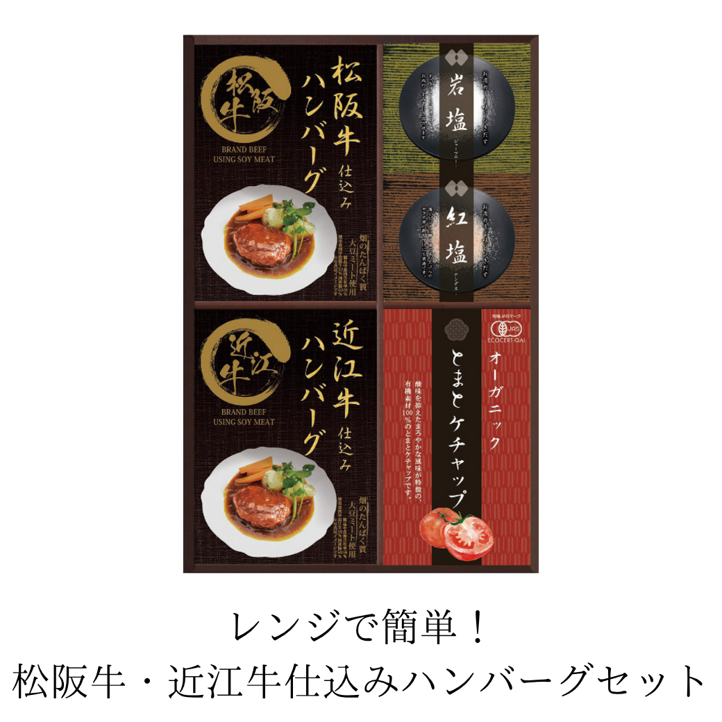 松阪牛仕込みハンバーグ(大豆ミート入)130g(固形量80g)・近江牛仕込みハンバーグ(大豆ミート入)130g(固形量80g)各1袋・ジャーマニー岩塩30g・アンデス紅塩30g各1袋・トマトケチャップ10g×8袋