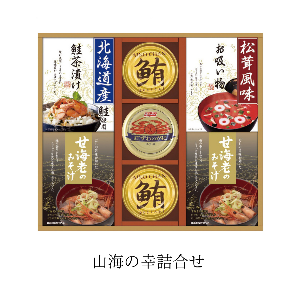 甘海老のみそ汁(7.5g×3袋)2箱・永谷園松茸風味お吸い物(2.3g×4袋)・北海道産鮭茶漬け(4g×3袋)各1箱・紅ずわいがにほぐし身55g×1缶・鮪油漬フレーク70g×2缶