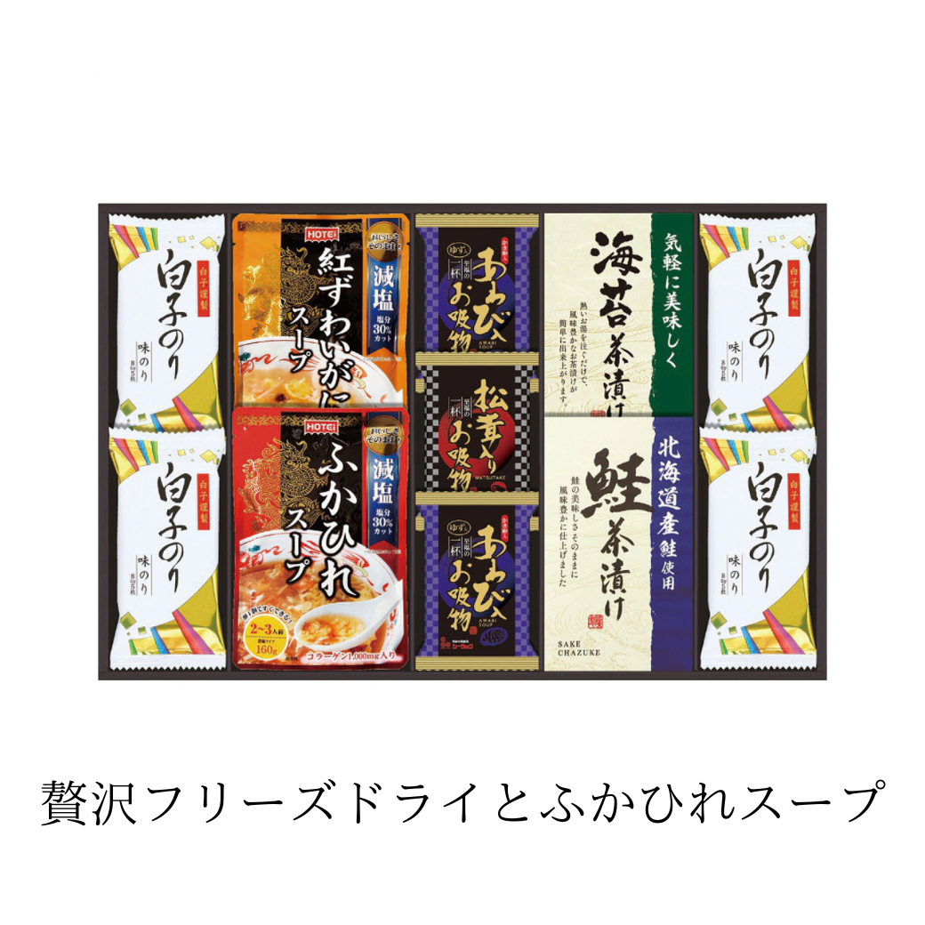 ふかひれスープ160g・紅ずわいがにスープ160g・松茸入お吸い物4.2g・北海道産鮭茶漬け(4g×2袋)・丸美屋海苔茶漬け(6g×2袋)各1袋・あわび入お吸い物4g×2袋・白子のり(8切5枚)4袋