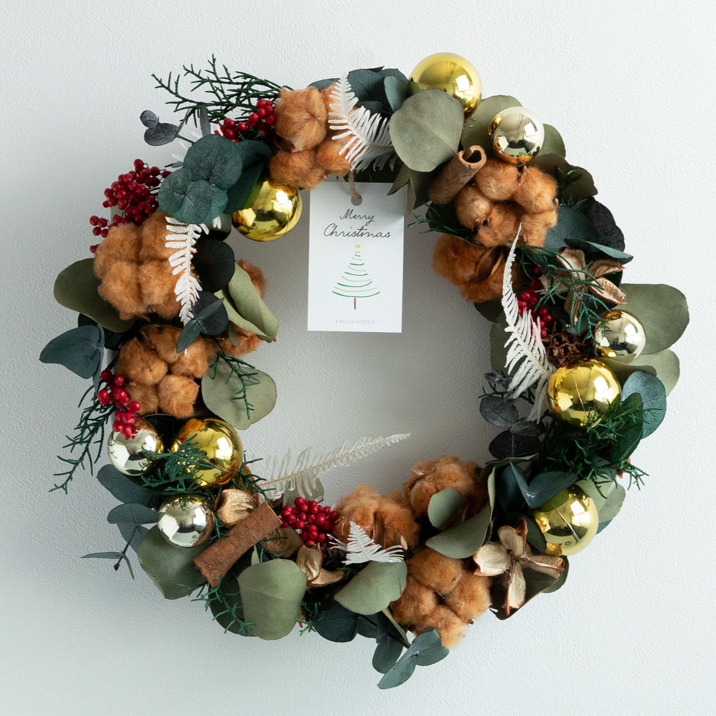 落ち着いた色合いの中にゴールドのオーナメントや赤い実をアクセントにお入れしているのでクリスマスらしさもお楽しみいただけます。