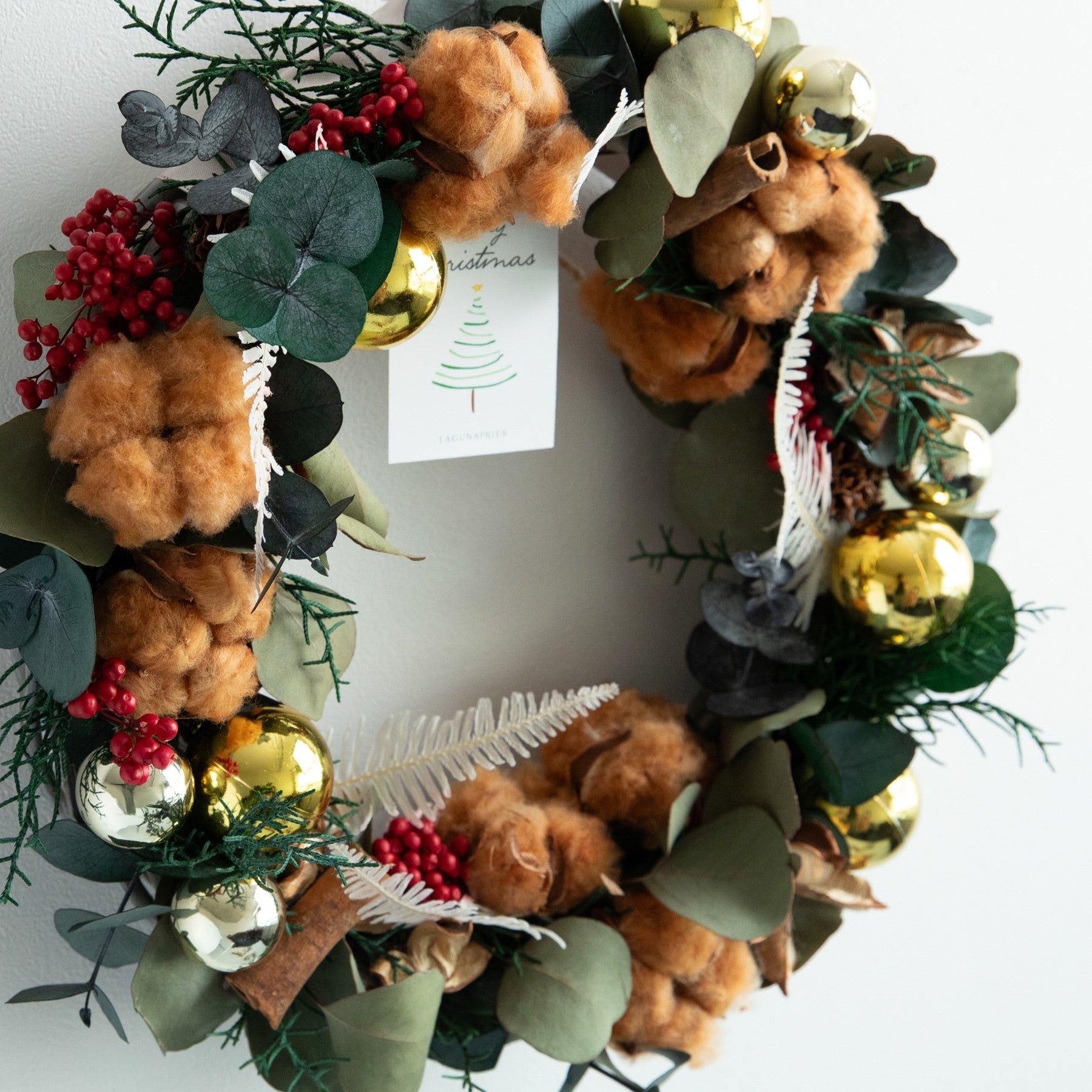 ユーカリやブラウンのコットンフラワー、木の実をふんだんに使用し、優しい雰囲気に仕上げたリースは、どんなお部屋にも合わせていただけます。