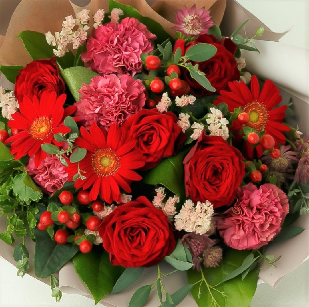 上品な赤のバラをあしらった花束は、結婚記念日や誕生日のお祝いにおすすめです。